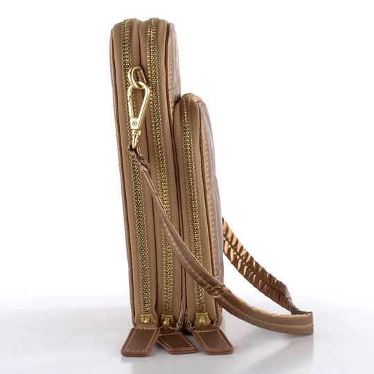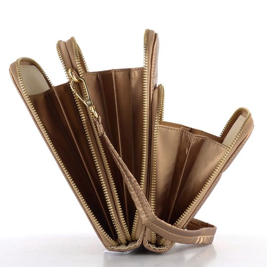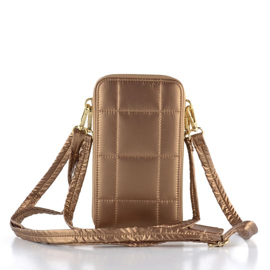 Malá dámská crossbody kabelka v metalické bronzové barvě s prošívaným vzorem a s variabilními popruhy.