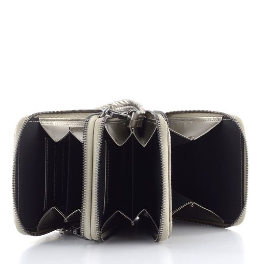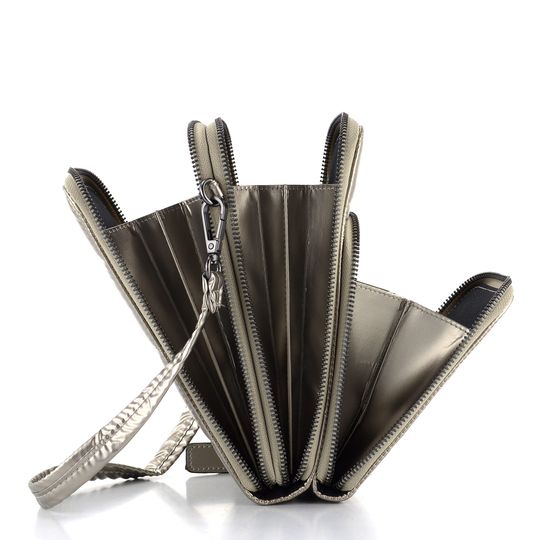 Navzdory svému malému střihu nabízí praktické uspořádání: dvě hlavní zipové kapsy, každá s pevnou přepážkou, přední kapsa s malou kapsičkou se slídou a zadní kapsa se čtyřmi přihrádkami na karty. Díky dvěma odepínatelným páskům – krátkému do ruky (45 cm) a nastavitelnému crossbody pásu (72 – 138 cm) – je kabelka maximálně univerzální.