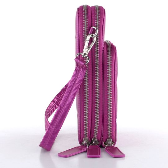 Stylová dámská crossbody kabelka od značky Ara je ideální volbou pro ty, kdo hledají kombinaci elegance a praktičnosti. Tento kousek je vyroben z hedvábně lesklé textilie s prošívaným čtvercovým vzorem, který zaujme na první pohled. Sytý fuchsiově růžový odstín dodává kabelce výrazný vzhled, zatímco stříbrné kování a zipy poskytují sofistikovaný kontrast. Kabelka je kompaktní, ale zároveň dostatečně prostorná na nezbytnosti. Nabízí dvě hlavní zipové kapsy, které jsou prakticky rozděleny pevnou přepážkou. Díky dvěma odepínatelným páskům ji lze nosit jak v ruce, tak přes rameno. Rozměry kabelky jsou 12 cm na šířku, 21 cm na výšku a hloubka dna je 6 cm.