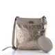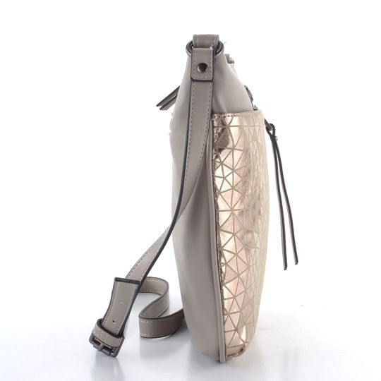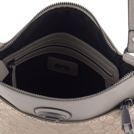 Stylová dámská crossbody kabelka od značky Ara je ideální volbou pro každodenní nošení. Vyrobena z poddajné hladké syntetiky, zaujme svou šedobéžovou barvou s metalickým vzorem na přední straně, který má růžově zlatý odstín. Praktická kabelka nabízí dostatek úložného prostoru díky hlavní zipové kapse a dalším kapsičkám na zip na přední a zadní straně. Vnitřní výbava zahrnuje 1 zipovou kapsičku, 2 přihrádky na mobil a šňůrku s karabinkou a odepínatelnou zipovou etují na klíče a jiné drobnosti. Ramenní pásek o délce cca 122 cm lze regulovat o ±7 cm. Kabelka má rozměry: šířka 24 cm, výška 27 cm, hloubka dna 3 cm. Perfektní doplněk pro podzimní a zimní sezónu ročníku PZ 2024/25.