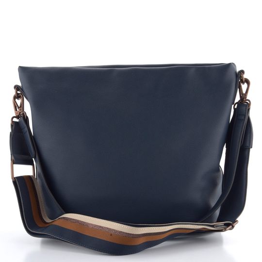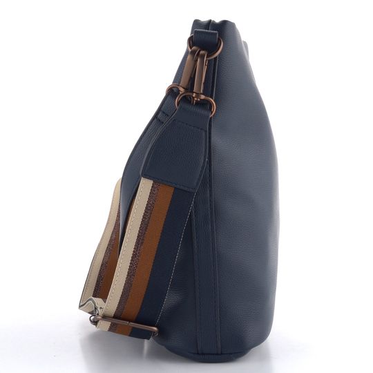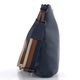 Kabelka má hlavní kapsu na zip a uvnitř najdete zipovou kapsičku, dvě přihrádky na mobil a řemínek s karabinkou. Součástí jsou dva vyměnitelné popruhy: odepínatelný ramenní pásek a délkově nastavitelný crossbody popruh o délce 72-118 cm, který je z jedné strany textilní s proužky v modré, hnědé, bronzové a béžové barvě, z druhé strany syntetický.