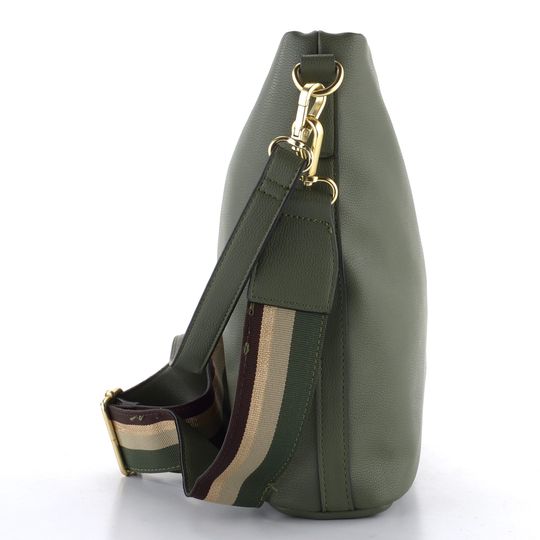 Součástí balení je odepínatelný ramenní pásek a délkově nastavitelný crossbody popruh (72-118 cm), který je z jedné strany textilní s proužky v zelené, hnědé, béžové a zlaté barvě, z druhé strany syntetický. Tento model je skvělým doplňkem pro každodenní nošení ve městě i do kanceláře.