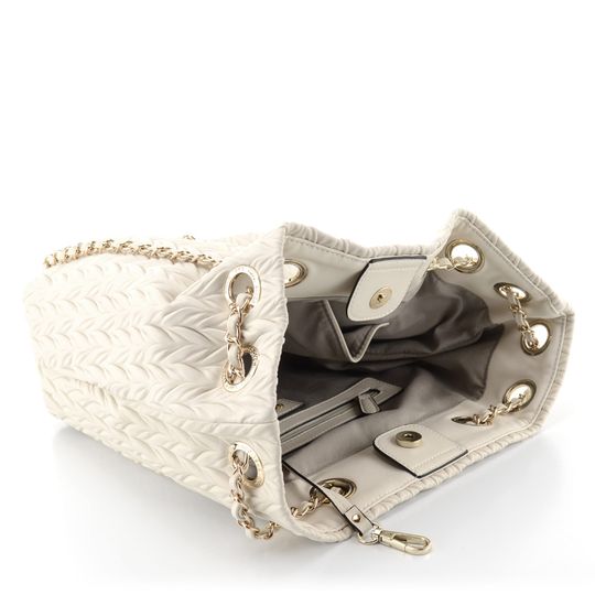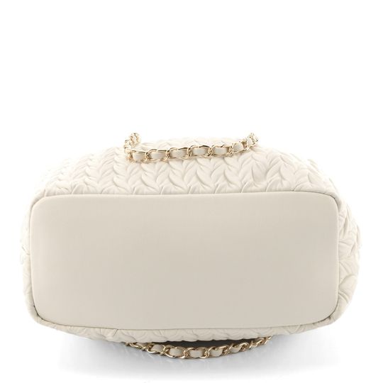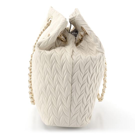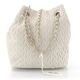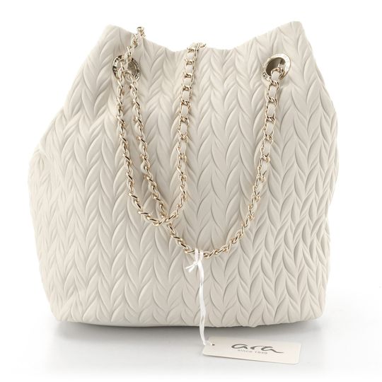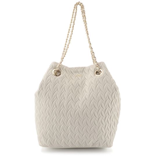 Nevšední dámská kabelka s plastickým vzorem ve světlé, smetanové barvě.