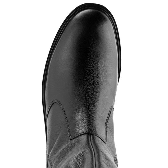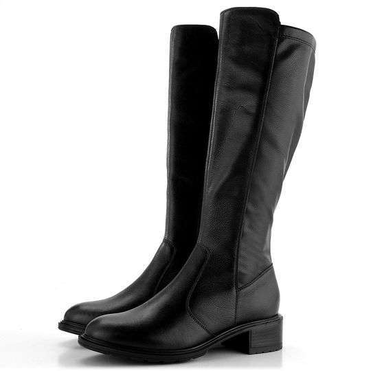 Černé kožené kozačky na pohodlném podpatku, s postranním zipem v celé délce a pružnou lýtkovou částí.