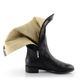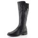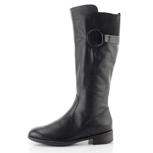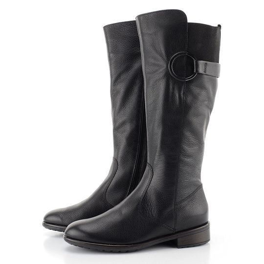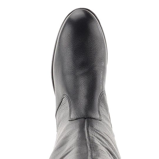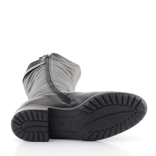 Černé kožené kozačky ve velikosti XL zaujmou strukturovanou hladkou kůží, kruhovou aplikací a vyvýšeným předním dílcem.