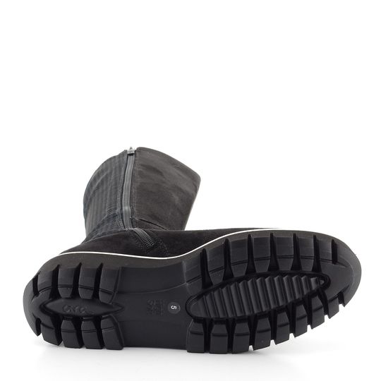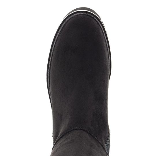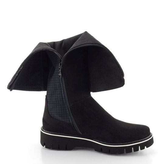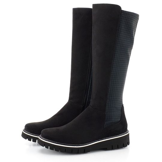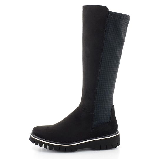 Dámské kozačky s módním pepito vzorem na lýtku a vyšší platformou vypadají velmi stylově.