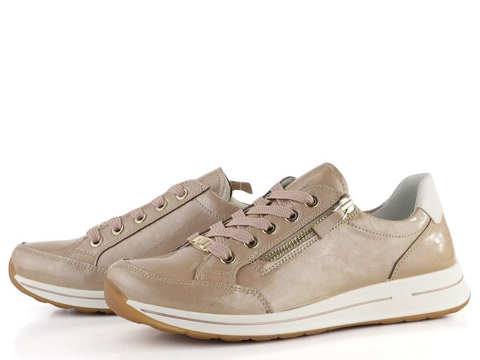 Ara dámské lakované sneakers se zipem v odstínu Nude/Cream jsou ideální volbou pro ty, kteří hledají komfort a styl v jednom. Tyto tenisky značky Ara nabízejí širší střih s deklarovanou šířkou H, což zajišťuje pohodlí i pro širší chodidla. Svršek z lakované kůže s jemnou mačkanou strukturou dodává botám unikátní vzhled, zatímco zlaté kovové detaily přidávají nádech elegance. Kombinace klasického šněrování a postranního zipu usnadňuje obutí. Vnitřní podšívka z bambusové froté textilie Ara bamboo® je prodyšná a šetrná k pokožce. Díky technologii HighSoft® je každý krok měkký a příjemný. Lehké a ohebné podešve zajišťují snadný pohyb, což činí tyto tenisky perfektní volbou pro městské prostředí.