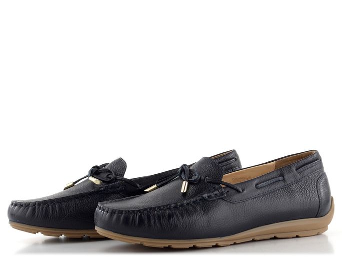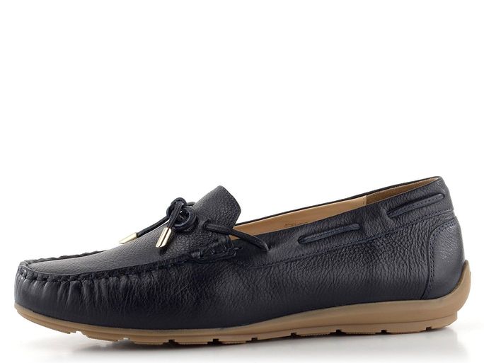 Dámské mokasíny značky Ara v temně modré barvě jsou ideální volbou pro jarní a letní sezónu. Tyto celokožené boty nabízí prostornou kulatou špičku a elegantní zvýšený šev na špičce. Nárt zdobí decentní mašlička s kovovými koncovkami ve zlaté barvě, což dodává obuvi sofistikovaný vzhled. Vnitřní podšívka je z poddajné kůže a semišový vnitřní opatek zajišťuje maximální pohodlí. Mokasíny jsou vybaveny vyjímatelnou pěnovou stélkou s koženým potahem, zesílenou patní zónou a podporou podélné nožní klenby. Kvalitní a extrémně ohebná latexová podešev spolu s modelovou řadou HighSoft® zaručují komfort při každém kroku. Podpatek o výšce 1,7 cm dodává botám jemný nádech elegance, aniž by snižoval jejich pohodlí. Tyto mokasíny jsou ideální pro každodenní nošení do města, do kanceláře nebo na lehkou procházku.