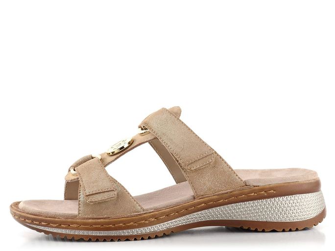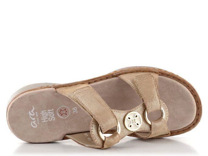 Hledáte stylové a pohodlné pantofle na léto? Pantofle značky Ara v béžové metalické barvě jsou ideální volbou. Jsou vyrobeny z jemně zabroušené kůže (nubuku) a ozdobeny světle zlatými detaily. Díky upínání na suchý zip na předním i nártovém pásku se snadno přizpůsobí vašemu chodidlu. Velmi příjemná, měkká a anatomicky tvarovaná stélka potažená broušenou kůží zaručuje maximální komfort při nošení. Modelová řada HighSoft® se vyznačuje měkkým svrškem, vypolstrovanou stélkou a flexibilní podešví, což propůjčuje obuvi jedinečnou flexibilitu a lehkost. S výškou podpatku 4 cm jsou tyto pantofle nejen elegantní, ale i pohodlné pro celodenní nošení. Perfektní volba pro jarní a letní sezónu.
