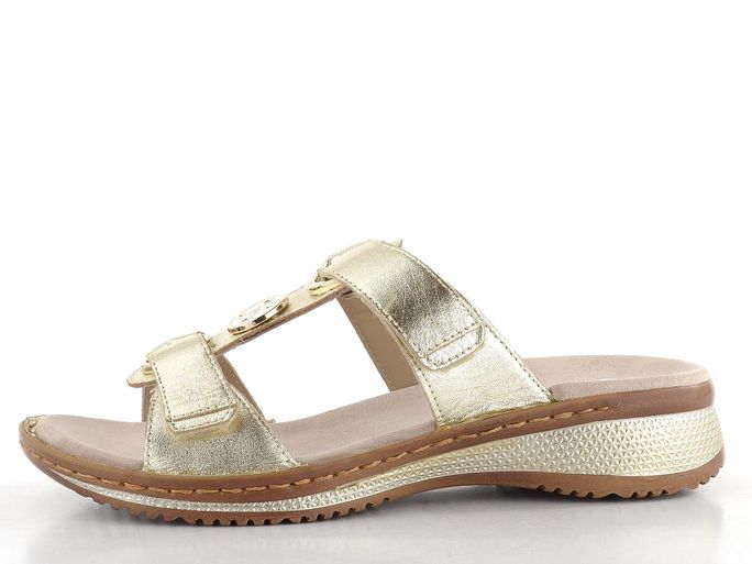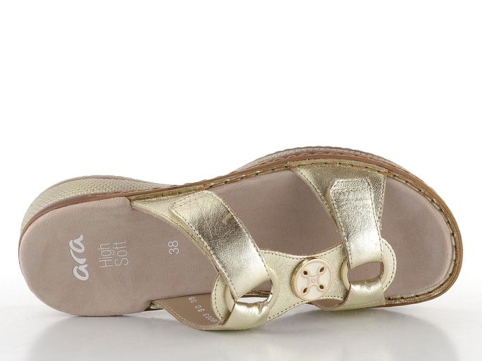 Ara dámské pantofle Hawaii Platin od značky Ara jsou ideální volbou pro ženy, které hledají styl a pohodlí v jednom. Tyto pantofle se vyznačují metalickou kůží ve světle zlatém odstínu, která dodává každému letnímu outfitu elegantní nádech. Kruhová ozdoba na nártu v bílé a zlaté barvě dodává pantoflím unikátní vzhled. Pásky na suchý zip umožňují snadné přizpůsobení a zajišťují pohodlné nošení. Technologie HighSoft® zajišťuje měkkost a flexibilitu, což v kombinaci s anatomicky tvarovanou stélkou poskytuje maximální komfort. S podpatkem 3,5 cm jsou tyto pantofle nejen elegantní, ale i praktické pro každodenní nošení.
