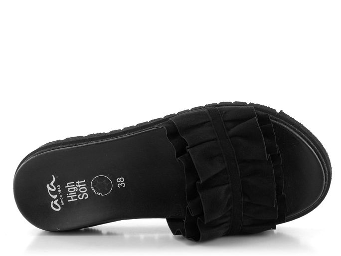 Vysoce komfortní dámské pantofle značky Ara jsou ideálním doplňkem pro váš letní šatník. Tento lehký model v černé barvě je vyroben z jemné semišové kůže, která zajišťuje maximální pohodlí. Nárt zdobí módní řasení a rubová strana nártového pásku je extra vyměkčená, což přidává na komfortu při nošení. Celokožená podšívka a modelová řada HighSoft® s měkkým svrškem, tvarovanou stélkou a flexibilní podešví zajišťují, že vaše nohy budou jako v bavlnce. Pantofle mají mírný klínek s výškou podpatku 3 cm, což přidává na elegantním vzhledu. Lepený výrobní způsob garantuje dlouhou životnost a odolnost. Perfektní volba pro každodenní nošení do města i do kanceláře.