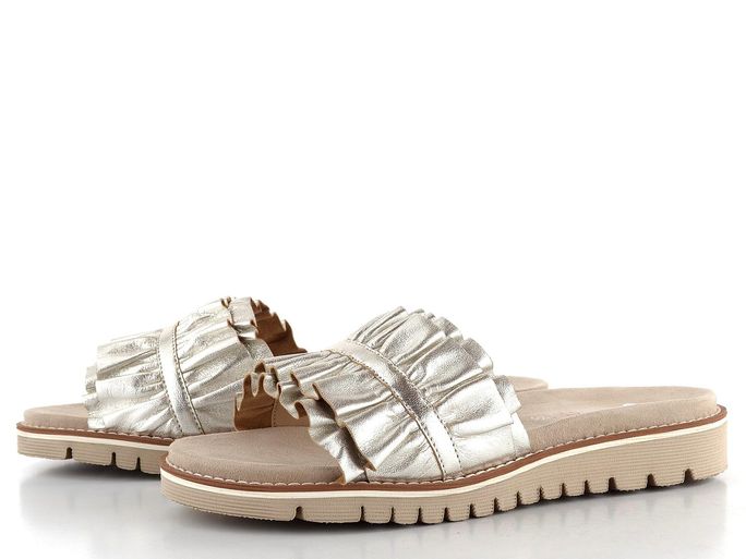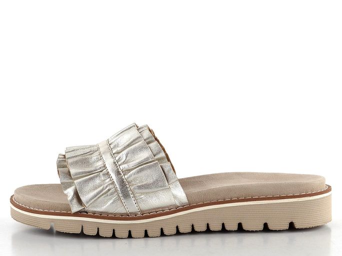 Vychutnejte si dokonalou kombinaci stylu a pohodlí s dámskými pantoflemi značky Ara. Tyto pantofle jsou ideální volbou pro letní dny, kdy chcete vypadat elegantně a cítit se pohodlně. Jemná metalická kůže ve světlé platinové barvě dodává botám luxusní vzhled, zatímco módní řasení na nártu přidává na originalitě. Díky technologii HighSoft® se můžete těšit na měkký svršek, tvarovanou stélku a flexibilní podešev, která poskytuje maximální komfort. Pantofle jsou lehké, s mírným klínkem a celokoženou podšívkou, což je činí ideálními pro každodenní nošení. Značka Ara klade důraz na kvalitu a udržitelnost, což z těchto pantoflí dělá nejen módní, ale i zodpovědnou volbu.