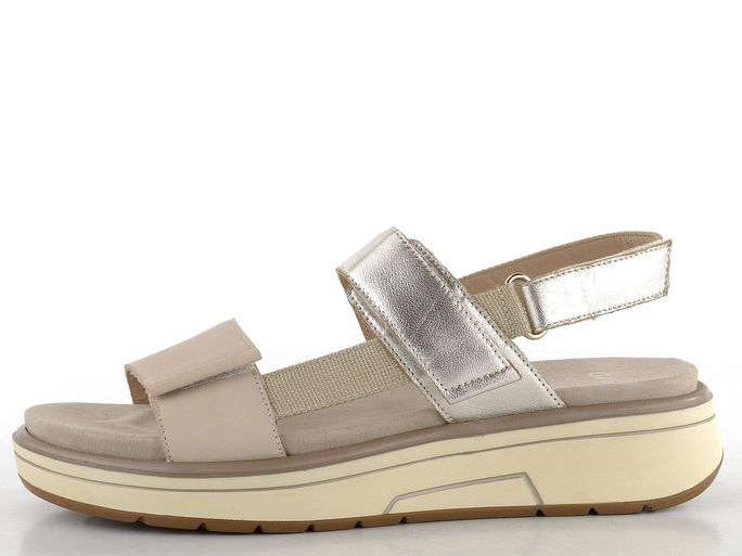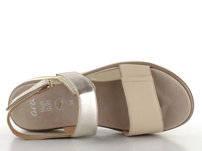 Zažijte pohodlí a styl se sandály značky Ara, které jsou ideální volbou pro jarní a letní dny. Tyto kvalitní celokožené sandály kombinují hladkou a metalickou kůži s textilními pásky, což vytváří elegantní spojení krémové, béžové a platinově zlaté barvy. Díky třem nastavitelným páskům na suchý zip se snadno přizpůsobí vašemu chodidlu. Sandály jsou vybaveny anatomicky tvarovanou, vyjímatelnou vložkou, kterou lze snadno čistit nebo nahradit vlastní ortopedickou. Technologie HighSoft® zajišťuje měkkost a flexibilitu při každém kroku. Vyšší syntetická podešev s mírným klínkem dodává stabilitu a komfort.