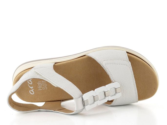 Dámské sandály značky Ara jsou ideální volbou pro jarní a letní dny. Tyto komfortní sandály s T-páskem v elegantní bílé barvě nabízejí prostorný střih v šíři "H", což je skvělé pro široké typy chodidel. Svršek z strukturální kůže a lehce odražená bílá barva dodávají sandálům šmrnc, zatímco ozdobné aplikace v bílé a stříbrné barvě přidávají na atraktivitě.
