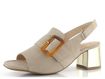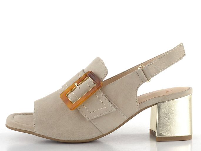 Dámské sandály značky Ara představují ideální spojení elegance a komfortu. Tyto módní sandály se širší šířkou H jsou navrženy pro širší typ chodidla, což zajišťuje pohodlí i při delším nošení. Svršek z semišové kůže v jemné béžové barvě s nádechem do šeda dodává botám sofistikovaný vzhled, který je umocněn karé špičkou a funkční sponou v karamelové barvě. Patní pásek se suchým zipem a měkká kožená stélka přispívají k pohodlí a stabilitě. Široký podpatek potažený metalickou kůží v platinově zlaté barvě přináší nejen styl, ale i jistotu při každém kroku. Tyto sandály jsou perfektní volbou pro běžné nošení i slavnostní příležitosti.