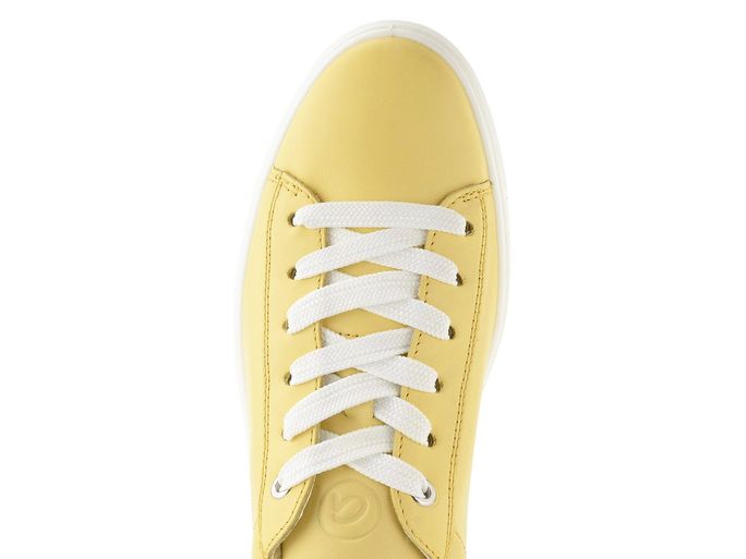 Dámské tenisky značky Ara kombinují styl a komfort v jedinečném provedení. Tyto kožené polobotky v vanilkově žluté barvě s krémovým doplňkem na patě jsou ideální volbou pro široké typy chodidel díky střihu H.