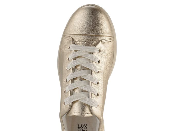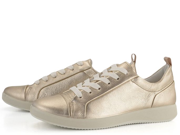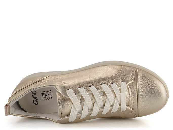 Dámské tenisky značky Ara vynikají svým komfortem a elegantním designem. Metalická zlatá barva a jemně strukturovaný kožený svršek dodávají botám luxusní vzhled. Díky šířce "H" jsou ideální pro širší typ chodidla, což zajišťuje pohodlí při každodenním nošení.