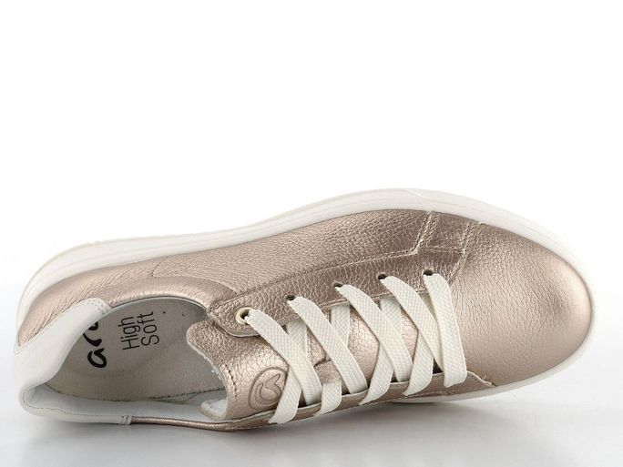 Zažijte pohodlí a styl s dámskými teniskami značky Ara v metalické béžové barvě. Tyto jednoduché polobotky vynikají svým komfortním kulatým střihem a standardní šíří, ideálními pro každodenní nošení ve městě. Svršek je vyroben ze strukturované kůže v jemné růžové metalické barvě s bílým detailem na patě. Klasické šněrování se širokými, plochými tkaničkami zajišťuje snadné přizpůsobení. Uvnitř naleznete textilní podšívku s bambusovou froté technologií Ara bamboo®, která poskytuje mimořádný komfort. Díky technologii HighSoft® nabízejí boty měkký svršek, polstrovanou stélku a flexibilní podešev, což zaručuje lehkost a ohebnost při každém kroku.