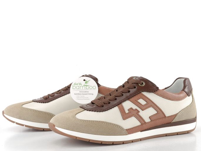 Dámské tenisky značky Ara kombinují styl a pohodlí v jedinečném designu. Svršek z hladké a semišové kůže v hnědo-bílé barevné kombinaci přitahuje pozornost a dodává každému outfitu šmrnc. Tento model je navržen s ohledem na prostorný střih G1/2, ideální pro normální až mírně širší chodidla.