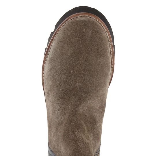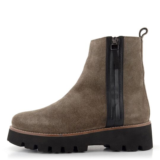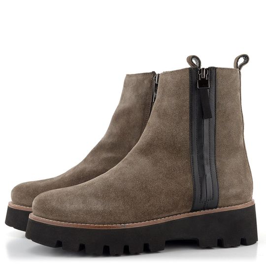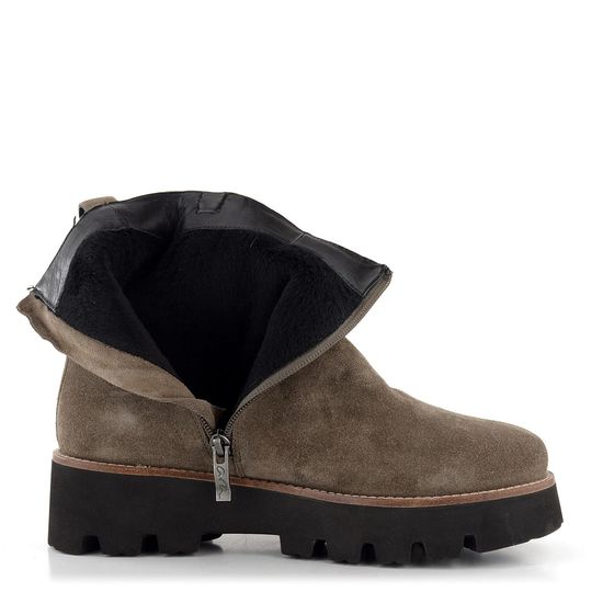 Dámský kotník z velurové kůže v šedobéžové barvě, s vnitřním funkčním zipem a robustní podešví.