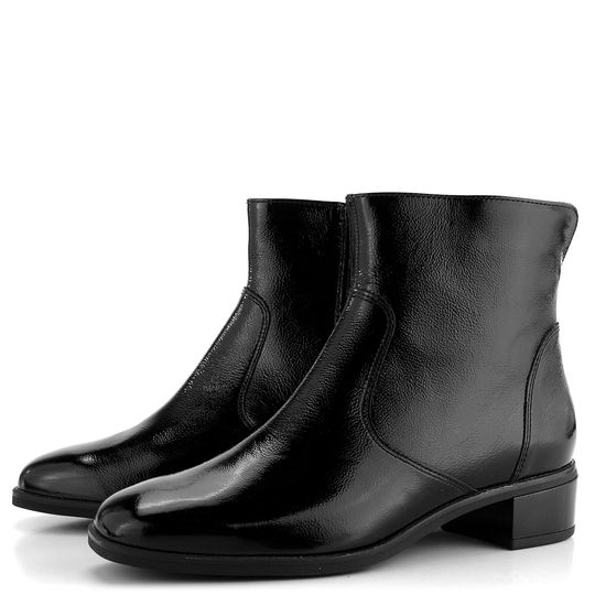 Elegantní kotníkové boty značky Ara v černém lakovaném provedení jsou ideální volbou pro ženy hledající styl a pohodlí. Tyto boty jsou navrženy pro podzimní a zimní sezónu, a díky šíři H jsou vhodné i pro širší typ chodidla. Svršek z jemně strukturované povrstvené kůže dodává botám luxusní vzhled, zatímco zip na vnitřní straně usnadňuje obutí.