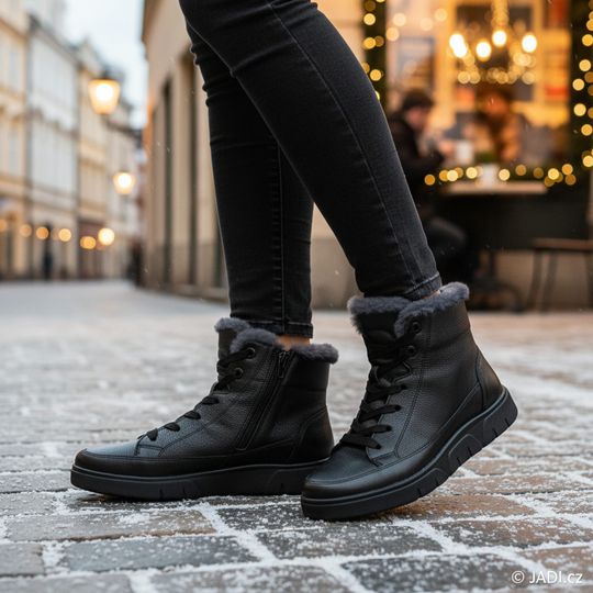 Design zahrnuje kulatou špičku a kožešinku v lemu a na jazyku, což přidává nádech luxusu. Šněrování umožňuje snadnou regulaci šíře, zatímco postranní zip zajišťuje rychlé a pohodlné obutí. Vnitřní vyztužený opatek a flexibilní latexová podešev přispívají k celodennímu komfortu.