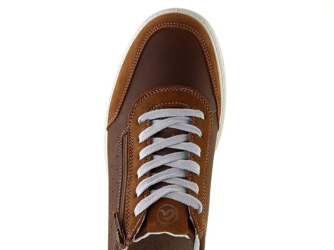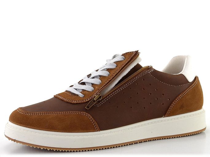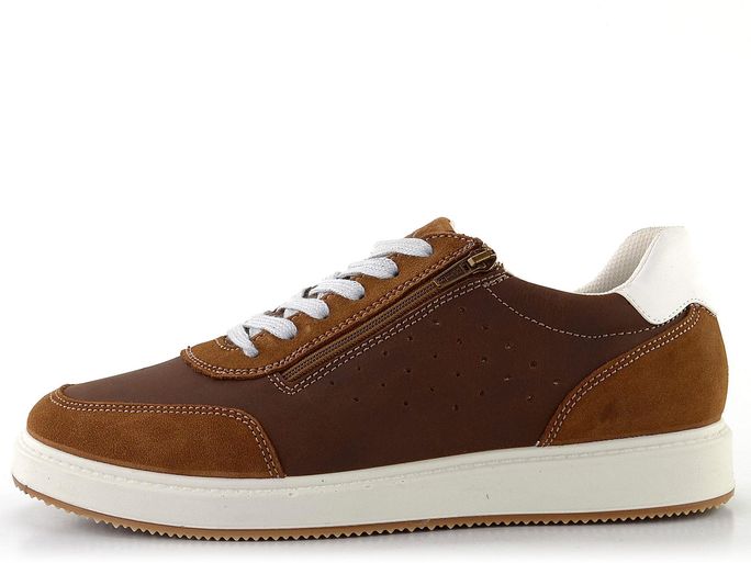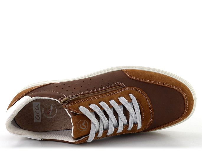 Objevte pohodlí a styl s pánskými polobotkami značky Ara. Tyto boty kombinují semišovou a hladkou kůži v elegantním koňakově hnědém a tmavě hnědém provedení, doplněné bílým patním dílem. Díky funkčnímu postrannímu zipu je obutí snadné a rychlé. Šněrování s plochými širokými tkanicemi dodává botám sportovní vzhled, zatímco vypolstrovaný lem a jazyk zajišťují maximální komfort. Uvnitř najdete měkkou a vyjímatelnou stélku s textilním froté potahem, která poskytuje pohodlí po celý den. Lehká syntetická podešev a lepený výrobní způsob zaručují dlouhou životnost. Ideální volba pro každodenní nošení v městském prostředí.