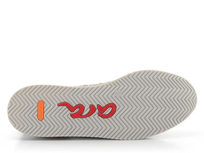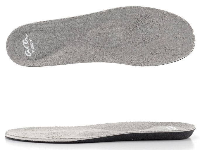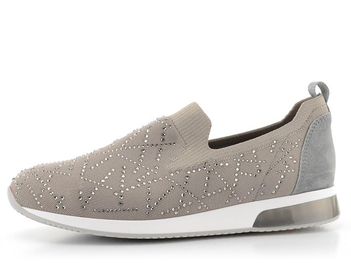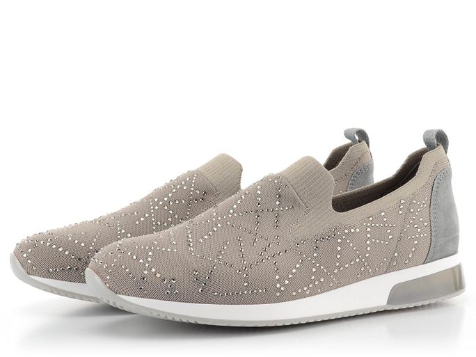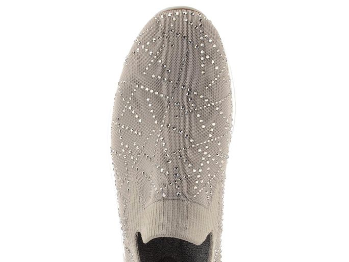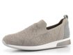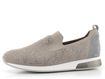 Strečové textilní mokasíny v šedohnědém odstínu s podešví podporující valivý pohyb.