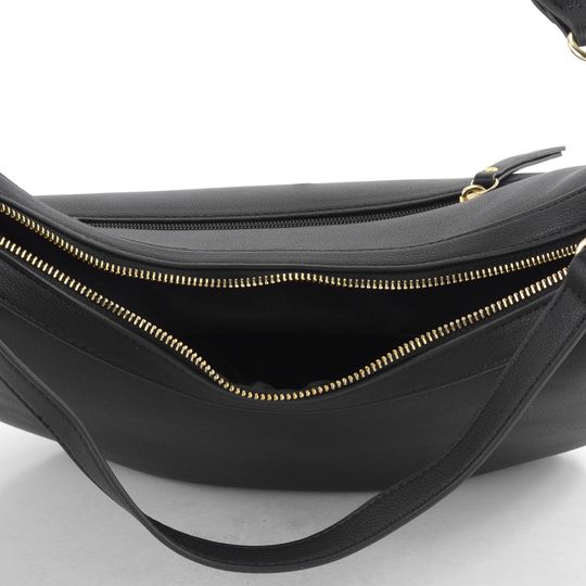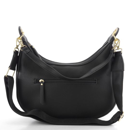 Na zadní straně naleznete praktickou zipovou kapsičku. Hlavní kapsa je rovněž na zip a uvnitř najdete zipovou kapsičku, dvě otevřené přihrádky na mobil a řemínek s karabinou pro bezpečné uchycení klíčů.