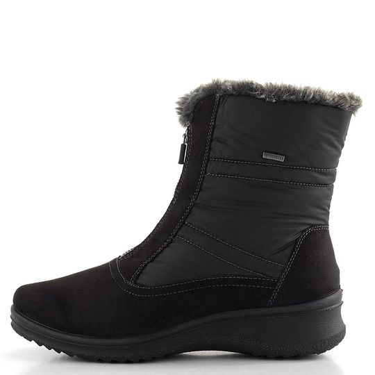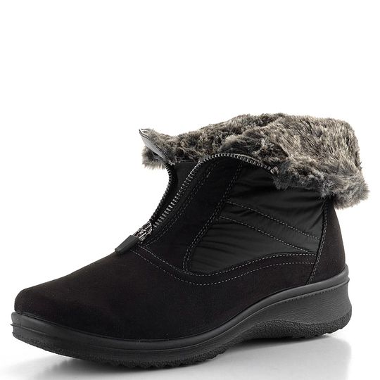 Pro chladné podzimní a zimní dny jsou tu kotníkové boty od značky Ara, model Schwarz München 12-48530-05. Tyto boty v černé barvě kombinují broušenou textilii a šusťákovinu, což jim dodává moderní vzhled a vysokou odolnost. Díky kulatému prostornému střihu a šíři H poskytují maximální pohodlí i pro širší chodidla. Pro snadné obutí je zde praktický přední zip, který je podložen légou. Boty jsou vybaveny teplou beránkovou podšívkou a vodoodpudivou membránou Gore-Tex®, která funguje jako tepelný izolant a chrání před vlhkostí. Komfortní odlehčená podešev s mírně zvýšenou patou a výška kotníku 16 cm zajišťují pohodlné nošení po celý den. Model je navíc opatřen vyjímatelnou stélkou, kterou lze snadno vyměnit. Tyto boty jsou ideální volbou pro ženy, které hledají stylovou a funkční obuv pro chladné měsíce.