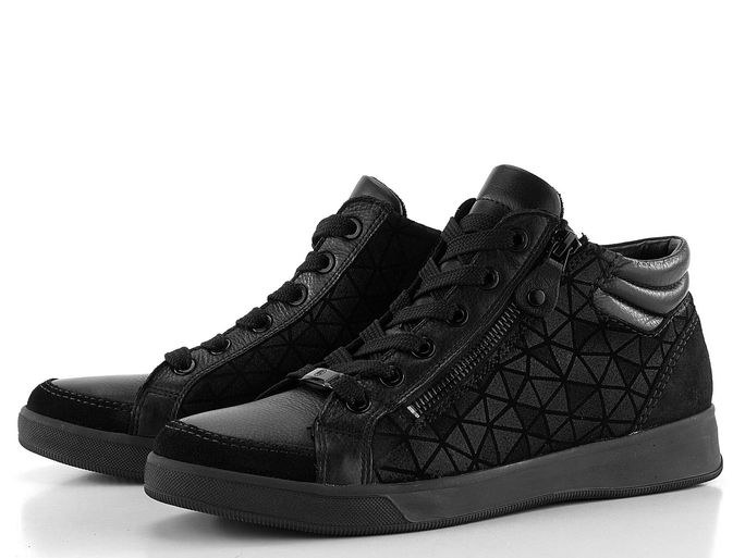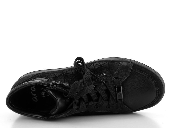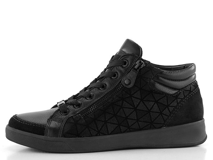 Značka Ara přináší stylové a pohodlné kotníkové tenisky ideální pro podzimní a zimní sezónu. Tyto černé boty s jemným leskem a vzorem nepravidelných trojúhelníků na boku se pyšní sportovnějším střihem. Vyrobené z hladké a zabroušené kůže, nabízí nejen estetický vzhled, ale i dlouhou životnost. Širší tkaničky a funkční postranní zip zajišťují snadné a rychlé obutí.