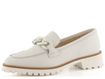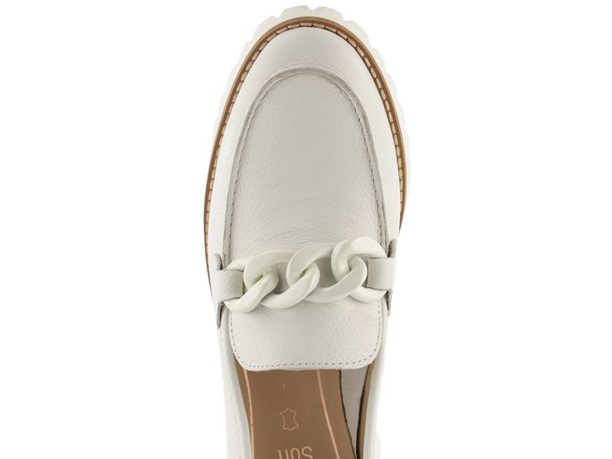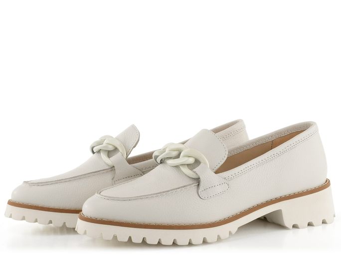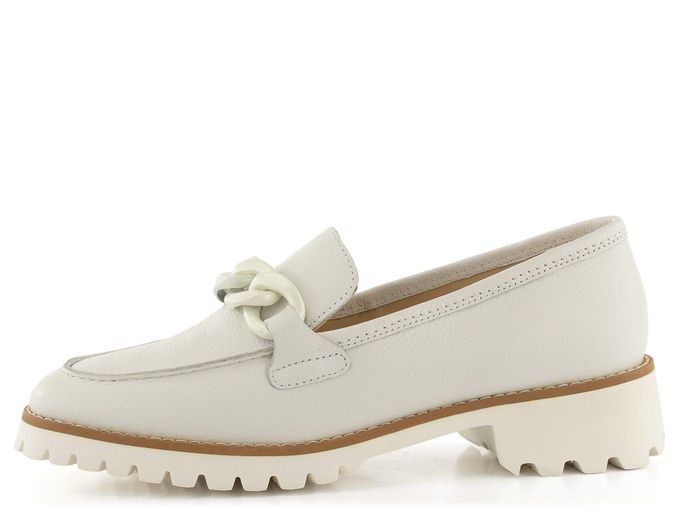 Dámské kožené mokasíny ve smetanově bílé barvě, na hrubé podešvi se širokým podpatkem.