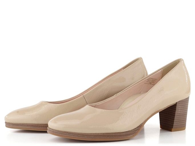 Elegantní lodičky značky Ara v jemné béžové barvě jsou ideální volbou pro každou příležitost. Tyto lodičky vynikají kulatější špičkou a svrškem z mačkané lakované kůže, což jim dodává sofistikovaný vzhled. Vnitřek obuvi je vybaven celokoženou podšívkou a extra měkkou stélkou s podporou podélné nožní klenby, což zajišťuje maximální komfort při nošení. Modelová řada HighSoft® se pyšní měkkým svrškem, vypolstrovanou stélkou a flexibilní podešví. Lodičky mají široký podpatek o výšce 6 cm, který poskytuje stabilitu a pohodlí po celý den. Vyšší latexová podešev a lepený výrobní způsob garantují dlouhou životnost. Poznámka: přirozené zvrásnění materiálu v namáhaných místech není vadou, ale typickou vlastností této kvalitní kůže.