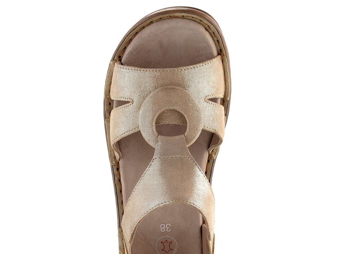 Komfortní dámské sandálky značky Ara vás zaujmou svým elegantním designem a vysokou kvalitou. Vyrobeny z jemné semišové kůže v béžovém odstínu se stříbrným metalickým leskem, tyto sandálky dodají vašemu outfitu nádech luxusu. Kulatá špička a ozdobná kulatá spona na nártu dodávají botám stylový vzhled, zatímco pruženky všité z obou stran nártového pásku zajišťují pohodlné obutí.