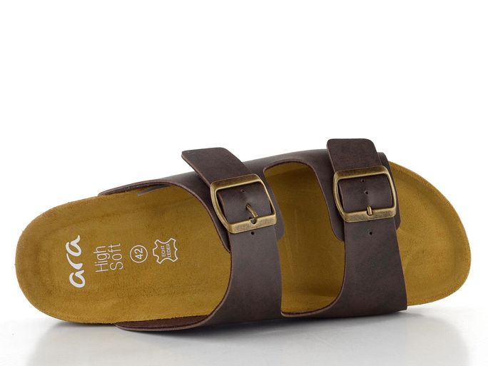 Pánské pantofle značky Ara jsou ideální volbou pro muže, kteří hledají komfort a styl v jednom. Tyto pantofle jsou navrženy pro vnitřní i venkovní použití, což je činí skvělou volbou pro každodenní nošení. Svršek z hladké syntetiky v tmavě hnědé barvě dodává botám elegantní vzhled, zatímco dva nastavitelné pásky se sponami zajišťují perfektní přizpůsobení. Anatomicky tvarovaná stélka potažená broušenou kůží a inovativní technologie HighSoft® poskytují maximální pohodlí. Lehká korková podešev se syntetickým nášlapem přináší nejen komfort, ale také trvanlivost a flexibilitu.