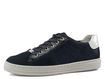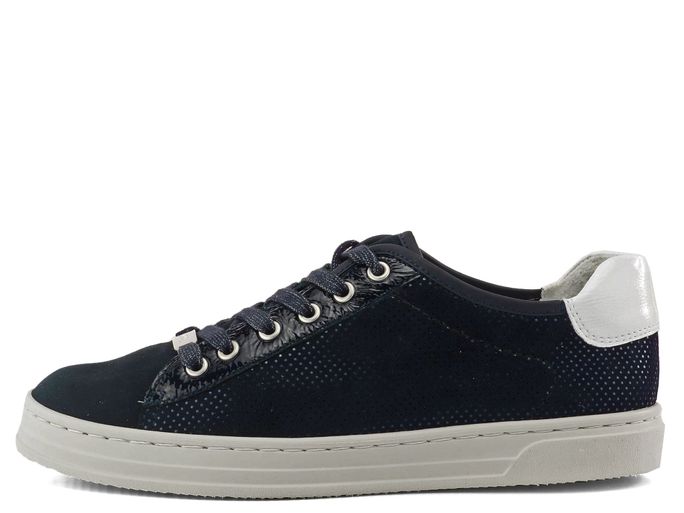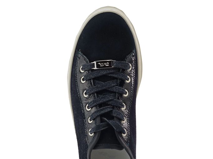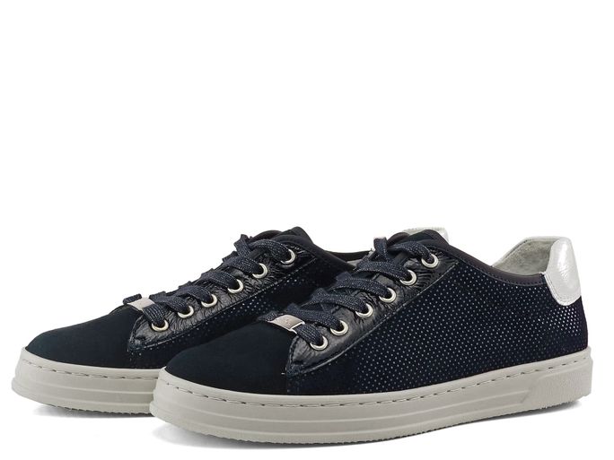 Lehké dámské teniskové polobotky v temně modré barvě, zvýrazněné metalickými puntíky a vyšší podešví.