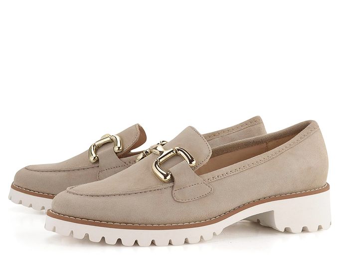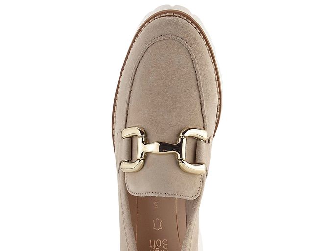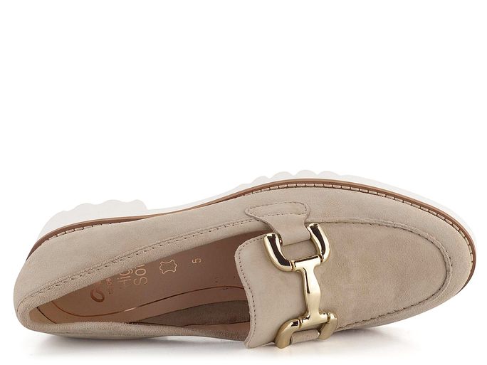 Dámské semišové mokasíny značky Ara představují ideální volbu pro jarní a letní sezónu. Tento model v elegantním béžovém odstínu zaujme svým módním mokasínovým stylem a užší kulatou špičkou, která je zvýrazněna ozdobným vyvýšeným švem. Svršek je vyrobený z kvalitní semišové kůže a nárt zdobí kovové kování ve zlaté barvě.