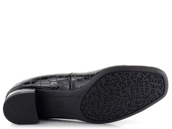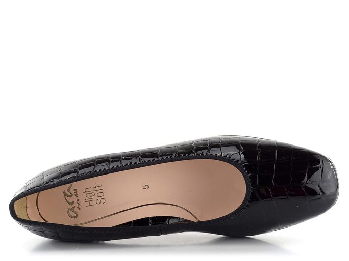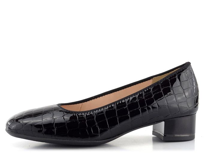 Dámské lodičky značky Ara v lakovaném provedení a širším střihu jsou ideální volbou pro ženy s širším typem chodidla. Lodičky jsou vyrobeny z kvalitní lakované kůže s elegantním "kroko" vzorem v černé barvě, což jim dodává sofistikovaný vzhled. Uvnitř najdete poddajnou celokoženou podšívku se zabroušeným opatkem, která zajišťuje maximální pohodlí při nošení.