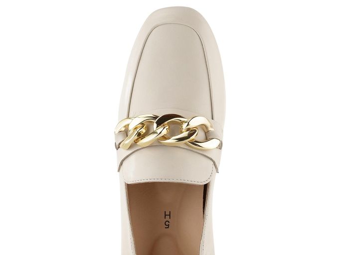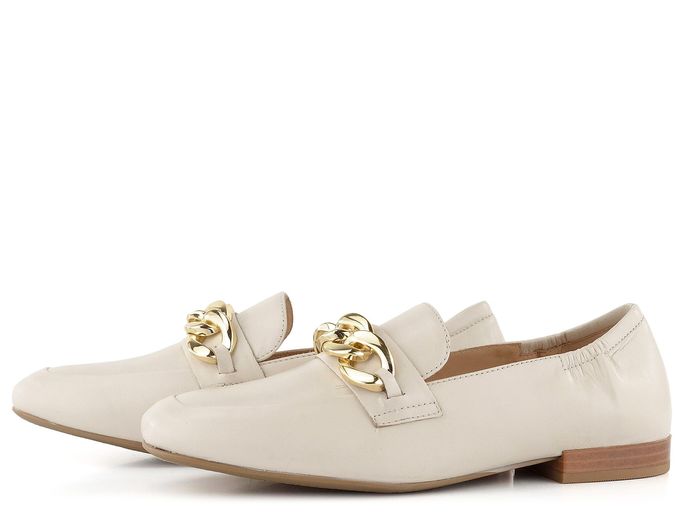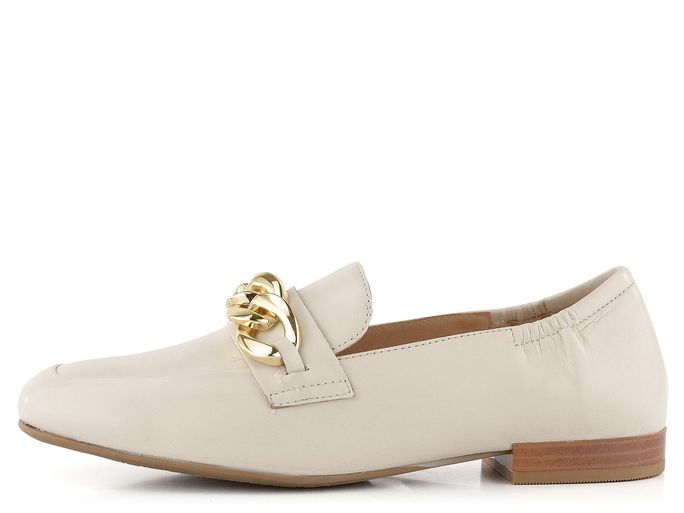 Elegantní dámské kožené mokasíny ve světle béžové barvě s ozdobným řetízkem přes nárt.