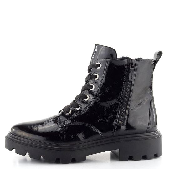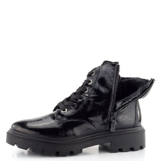 Trendové dámské kotníkové boty od značky Ara jsou ideální volbou pro podzimní a zimní sezónu. Nabízejí prostorný kulatý střih šířky H, který je vhodný pro širší typ chodidla. Svršek z lakované kůže s jemnou mačkanou strukturou v elegantní černé barvě zaujme na první pohled. Boty jsou vybaveny klasickým šněrováním a funkčním zipem na vnější straně pro snadné obutí.