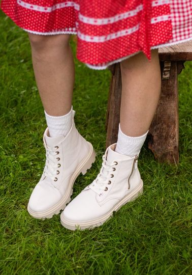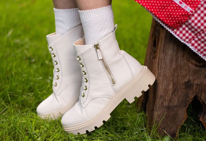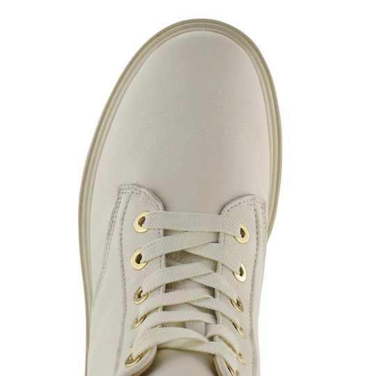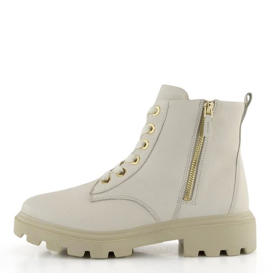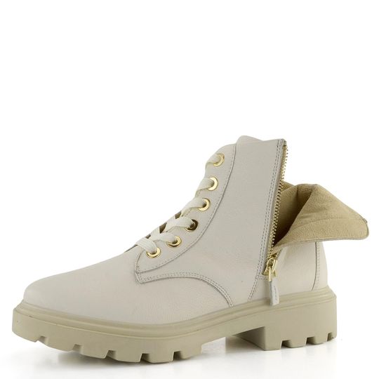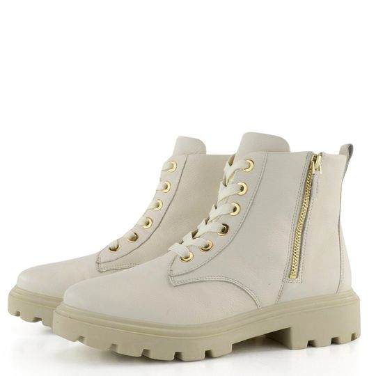 Trendové dámské kotníkové boty značky Ara jsou ideální volbou pro podzimní a zimní sezónu. Tyto boty vynikají prostorným kulatým střihem, který je vhodný pro širší typ chodidla (šířka H). Svršek je vyroben z kvalitní strukturované kůže v světlé krémové barvě, doplněné o kovové prvky ve světle zlatém odstínu.