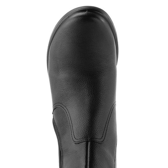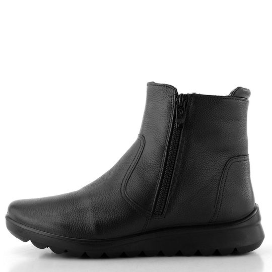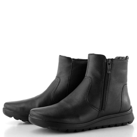 Komfortní širší dámský kotník z hladké kůže v černé barvě s teplou vlněnou podšívkou a vnějším zipem pro snadné obutí.