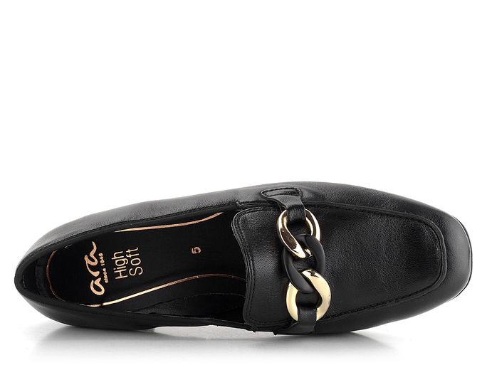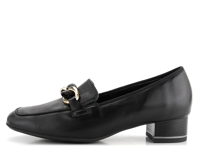 Objevte dokonalé spojení elegance a pohodlí s dámskými lodičkami značky Ara. Tyto lodičky v mokasínovém střihu jsou ideální volbou pro podzimní a zimní sezónu. Díky širšímu střihu "H" a hranatější špičce poskytují maximální komfort i pro širší chodidla. Svršek i podšívka jsou vyrobeny z kvalitní, poddajné kůže, která se přizpůsobí tvaru nohy. Na nártu najdete ozdobný kovový řetízek ve zlaté a matné černé barvě, který dodává botám luxusní vzhled. Lodičky jsou vybaveny inovativní technologií HighSoft®, která kombinuje měkký svršek a polstrovanou stélku pro dokonalé pohodlí. Flexibilní latexová podešev a stabilní lakovaný podpatek o výšce 3,5 cm zajišťují bezpečný krok. Vsaďte na kvalitu a styl s lodičkami značky Ara.