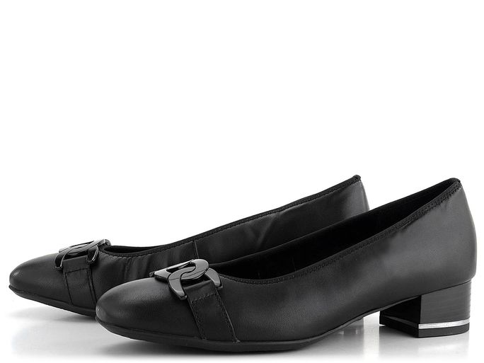 Pro dámy hledající eleganci a pohodlí jsou tu lodičky značky Ara v širším střihu "H". Tyto černé lodičky se vyznačují hranatější špičkou a jsou vyrobeny z poddajné hladké kůže, což zajišťuje maximální komfort. Špičku zdobí kovový řetízek v černém lesklém provedení, který dodává botám luxusní vzhled. Díky pružnému lemu se lodičky optimálně přizpůsobí noze.