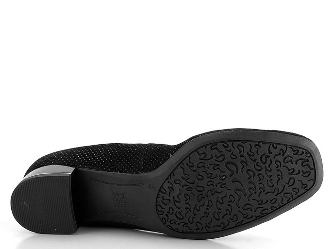 Elegantní dámské lodičky ze semišové kůže s puntíkatým vzorem, v širším střihovém provedení se stabilním podpatkem.