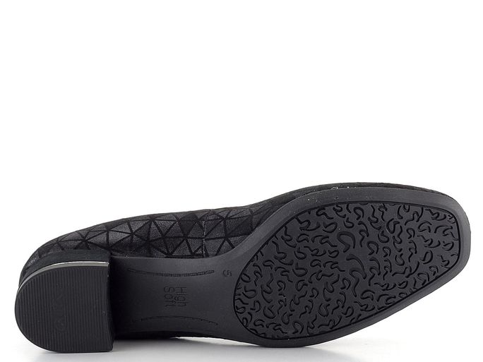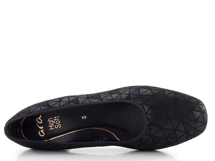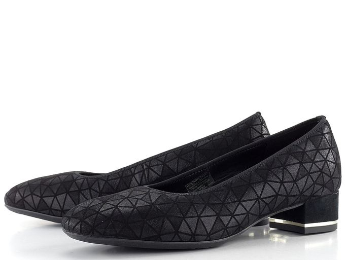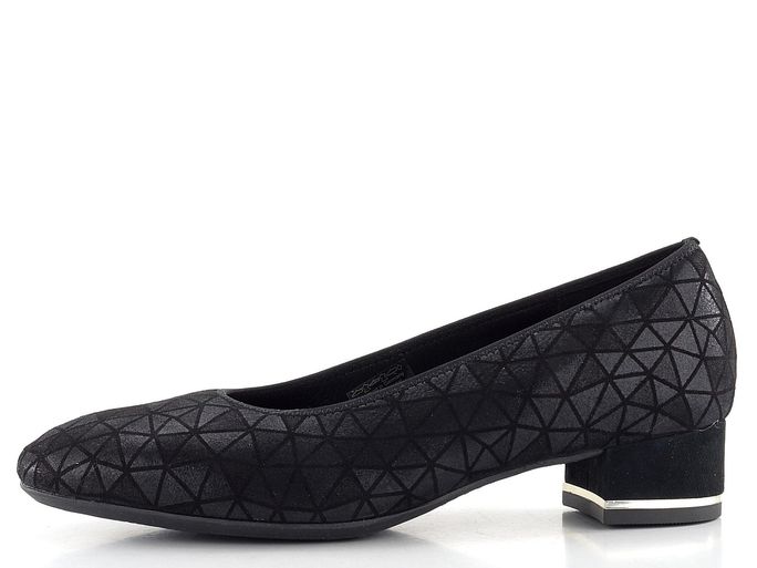 Elegantní a komfortní, to jsou lodičky značky Ara v metalické černé barvě s jemným vzorem. Tento model se pyšní prostornějším střihem s šířkou "H" a hranatější špičkou, což zaručuje pohodlí i pro širší chodidla. Svršek je vyroben z poddajné lehce zabroušené kůže, která spolu s pružným lemem zajistí optimální přizpůsobení. Uvnitř naleznete celokoženou podšívku a extra měkkou stélku s podporou podélné nožní klenby, což přispívá k celodennímu komfortu. Lodičky jsou vybavené inovativní technologií HighSoft®, která kombinuje měkký svršek, vypolstrovanou stélku a flexibilní podešev. Extra ohebná latexová podešev a pohodlný široký podpatek vysoký 3,5 cm, potažený kůží a zdobený metalickým proužkem, dodávají těmto lodičkám nejen styl, ale i stabilitu. Tento model je ideální volbou pro podzimní a zimní sezónu 2024/25.