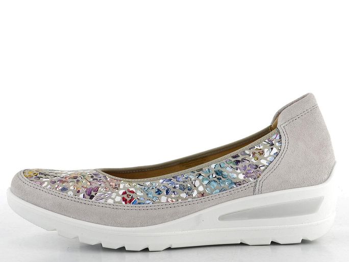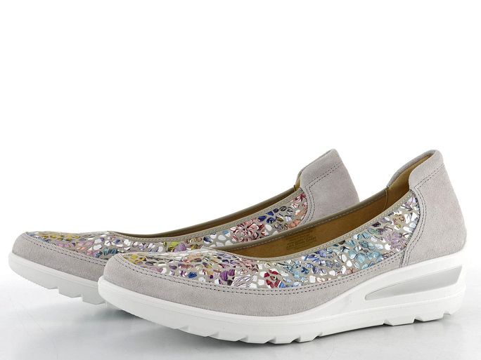 Zažijte pohodlí a styl s dámskými lodičkami na klínu od značky Ara. Tyto lodičky jsou navrženy pro ženy s širším typem chodidla, což zajišťuje optimální komfort díky střihu H. Svršek z semišové kůže s jemným potiskem v kombinaci světlé šedé barvy a pestrých odstínů jako bílá, žlutá, růžová a modrá dodává botám jedinečný vzhled. Technologie HighSoft® kombinuje měkký svršek, polstrovanou stélku a flexibilní podešev, což činí každý krok pohodlným. Vyjímatelná stélka s podporou klenby a paty zajišťuje dlouhodobý komfort. Ideální volba pro ženy, které hledají stylovou a pohodlnou obuv pro každodenní nošení.