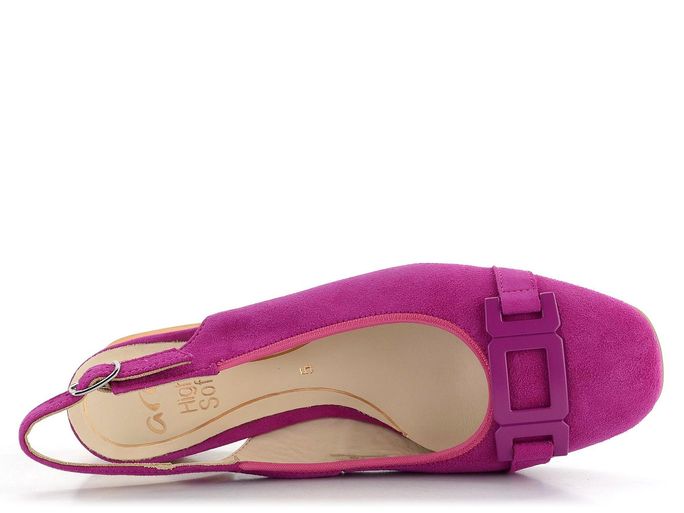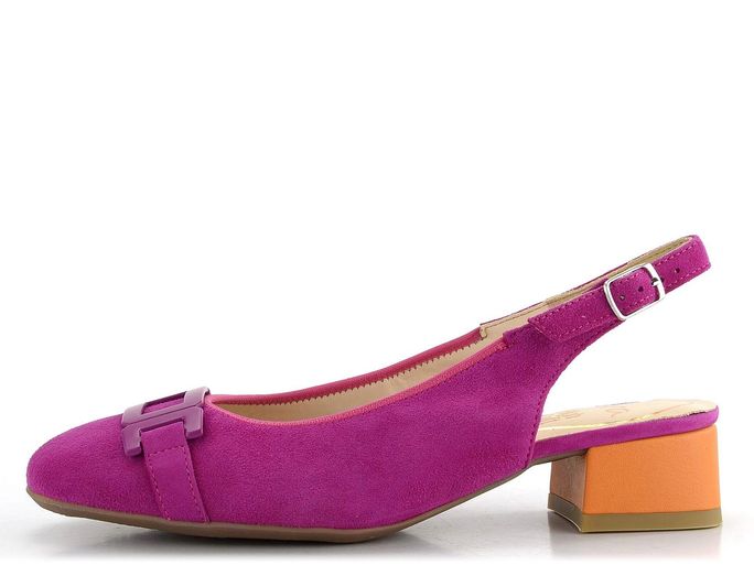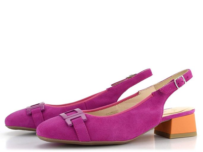 Elegantní a pohodlné, to jsou dámské lodičky s volnou patou od značky Ara, které vás zaujmou svým širším střihovým provedením. Tyto lodičky vynikají hranatějším tvarem špičky a jsou vyrobeny z jemné semišové kůže v sytém odstínu růžové (magenta) s oranžovými detaily. Špičku zdobí kovový řetízek s nástřikem, což dodává botám moderní vzhled.