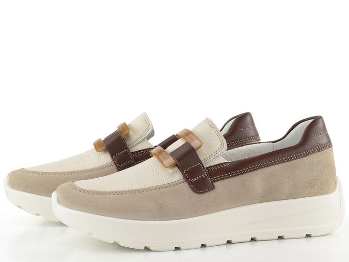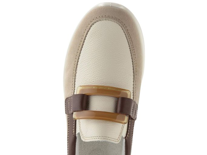 Dámské široké mokasíny značky Ara představují ideální volbu pro jarní a letní dny. Tyto prozíravé polobotky v kombinaci bílé, béžové a tmavě hnědé barvy jsou navrženy pro ženy s širším typem chodidla, díky čemuž poskytují maximální komfort. Svršek z hladké, strukturované a semišové kůže je doplněn pruženkami po stranách nártu, což usnadňuje obutí.