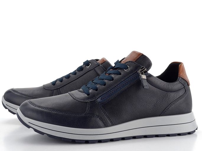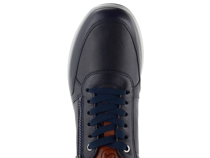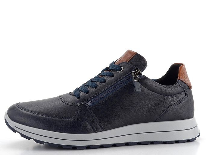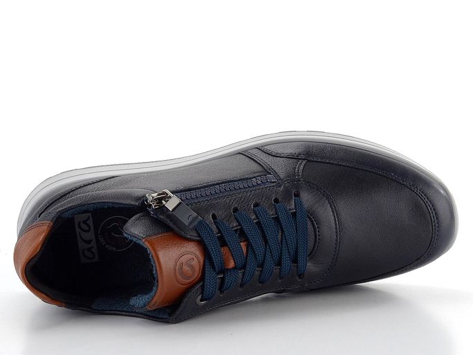 Objevte pohodlí a styl s pánskými teniskami značky Ara. Tyto tenisky jsou vyrobeny z hladké kůže v elegantní tmavě modré barvě, doplněné o hnědé prvky na patě a jazyku. Díky šířce H jsou ideální pro širší chodidla. Šněrování s plochými tkanicemi a funkční postranní zip zajišťují snadné obutí a pohodlí při každodenním nošení. Vnitřní podšívka z froté textilie Ara bamboo® poskytuje prodyšnost a udržuje přirozené klima v obuvi. Extra měkká, vyjímatelná stélka s textilním froté potahem a pevná podešev s hrubým vzorkem zaručují komfort a stabilitu. Vhodné pro městské prostředí, lehkou procházku nebo do kanceláře. Vyberte si kvalitu a udržitelnost s teniskami značky Ara.